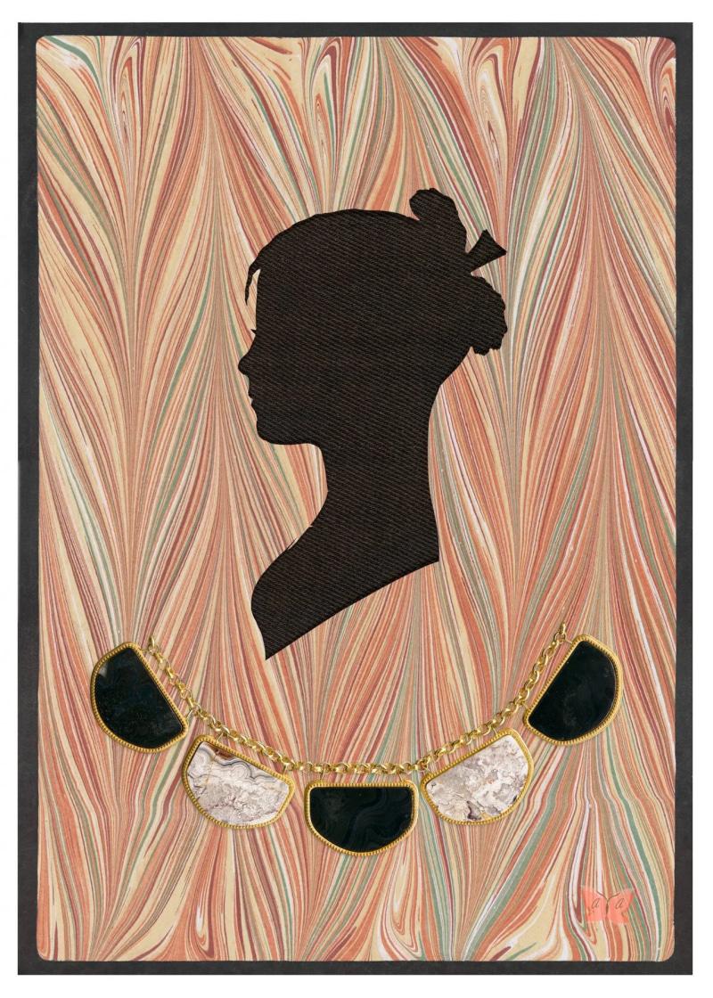 What’s dress up time without playing with mom’s jewelry? This silhouette profiles an anonymous and ubiquitous archetype of a young victorian girl.?These cutting portraits generally in profile from black card became popular in the Victorian mid-18th century. The interior of a silhouette is featureless, and the backgrounds are usually white. This design captures a literary spirit of the tradition of these cut out portraits.The girl is placed on a fresh chevron background in a swirl of peach, green and yellow hues. The paper is produced in the same method as marbled paper seen in the book bindings from fine antique books, called Ebru, from Turkey.?