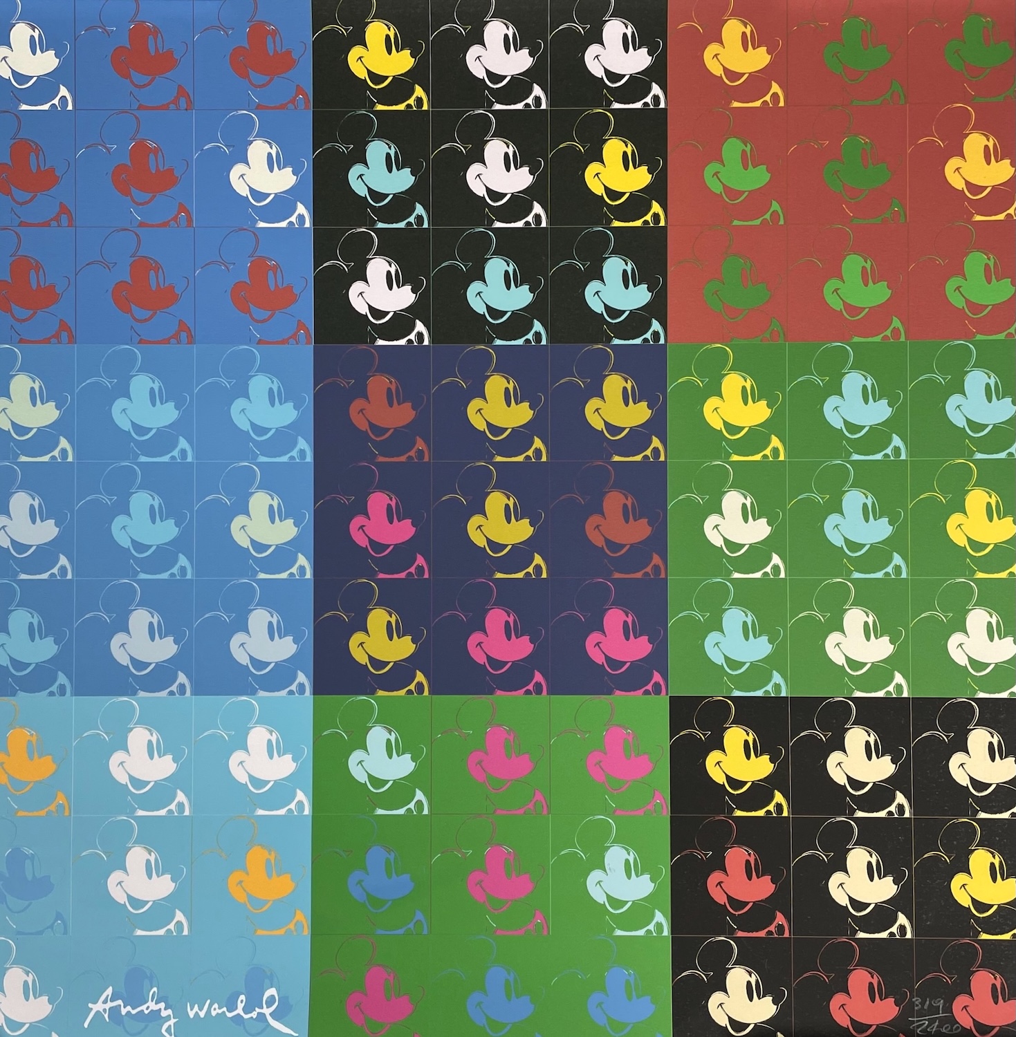 Mickey Mouse Collage is a striking lithograph by Andy Warhol, showcasing his unique interpretation of one of the world’s most beloved cartoon characters. In this work, Warhol blends his signature Pop Art aesthetic with collage-like visual elements, presenting Mickey Mouse through vibrant blocks of color, bold outlines, and overlapping forms that create a dynamic and playful composition. Unlike his Myths series, this piece stands independently as an homage to the influence of mass media and popular culture. Warhol transforms the familiar figure of Mickey Mouse into a modern cultural icon, emphasizing both the simplicity and power of recognizable imagery. The lithographic technique captures crisp lines and vivid hues, reinforcing Warhol’s fascination with reproduction and the blurring of boundaries between commercial art and fine art.